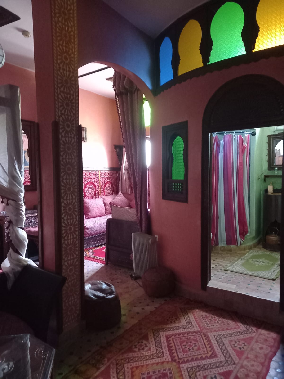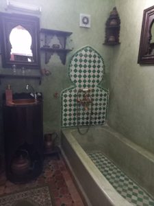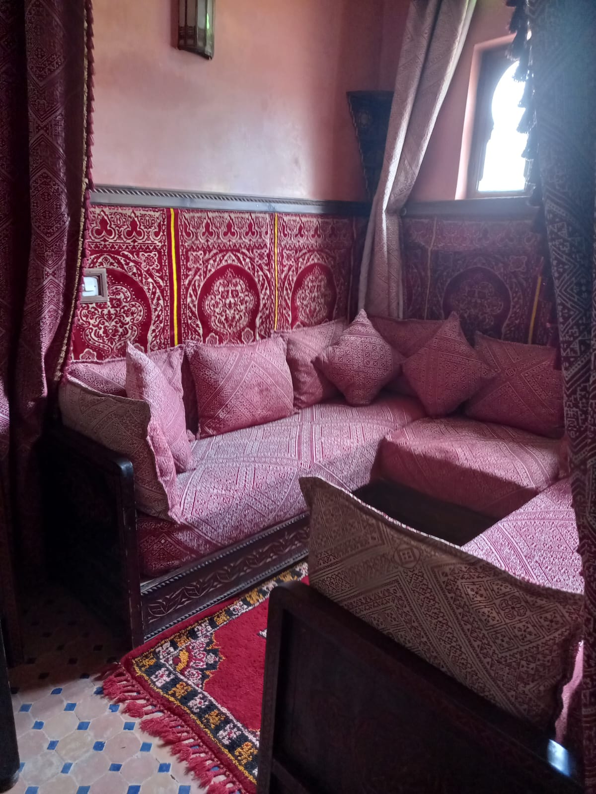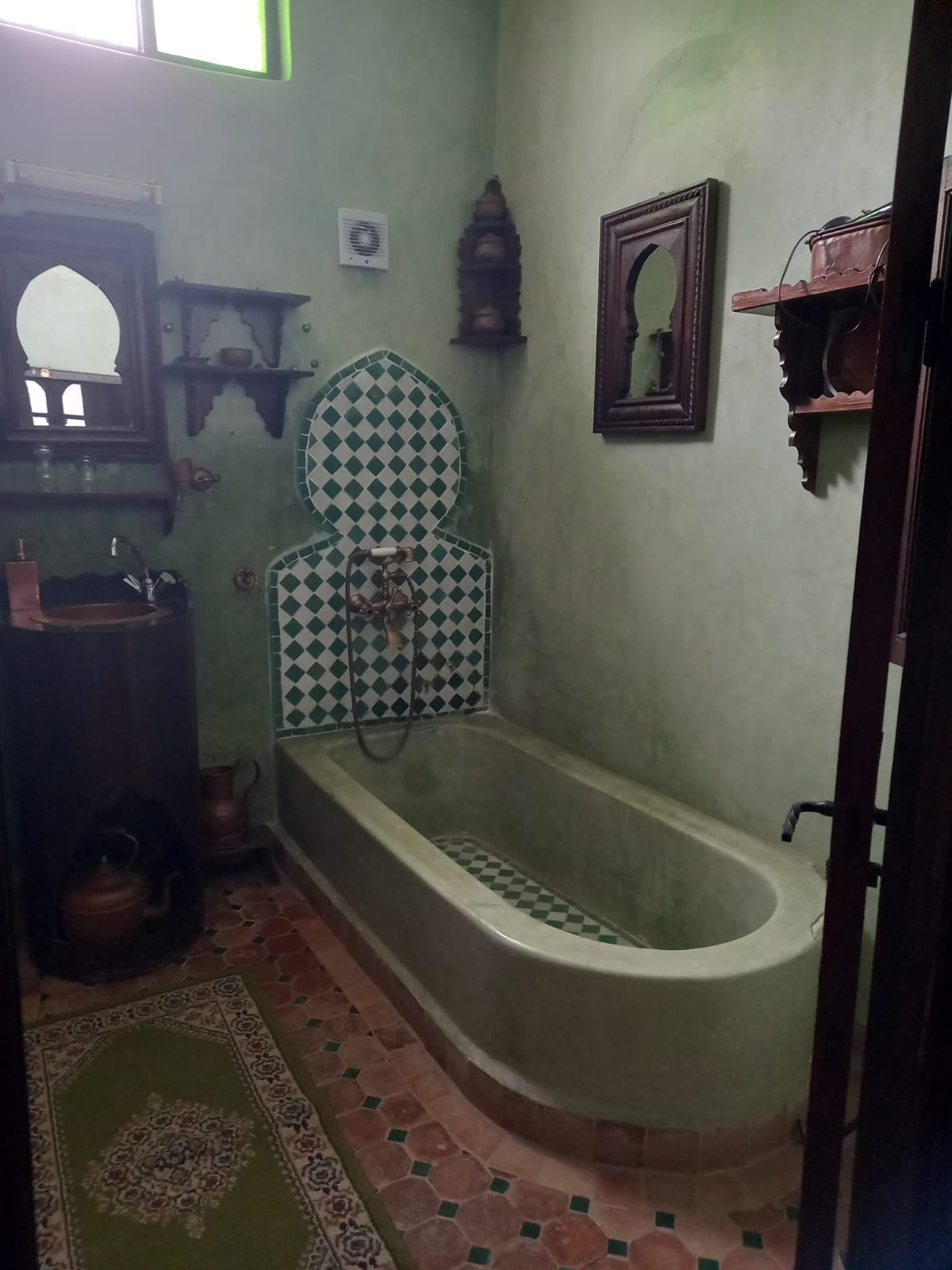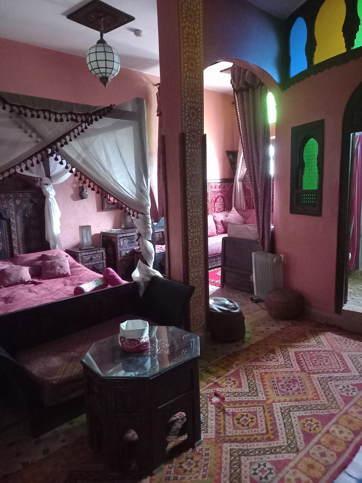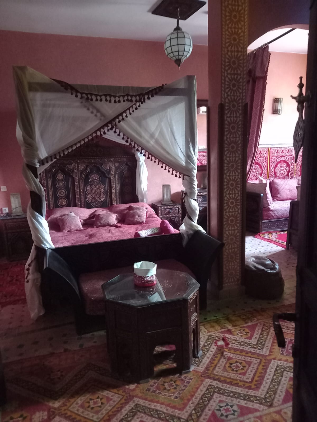 Decorated in the rural style of sculpted wood “chleuhowi” and “tadelekt” from Marraekech, this large and spacious family room contains a 4 poster “extra king-size” bed, a large bathroom with bath and shower and room to sleep up to 3 children. It is also a fantastic room for a couple wishing to treat themselves to a more luxurious experience.